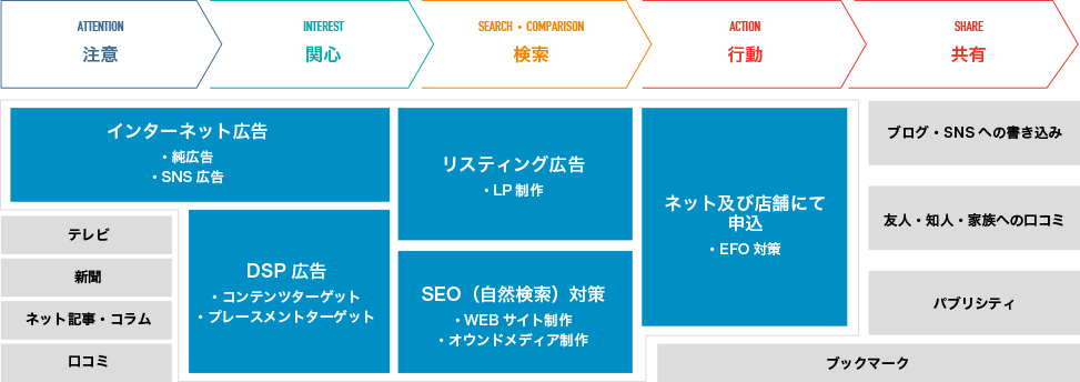 最近では、AISASがさらに進化してDual AISASという新しいモデルも生まれており、ユーザーのWEBからの流入経路が複雑になっていますが、今回はその根本であるAISASを使って弊社のWEB集客プロモーションの全体像をご紹介します。